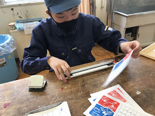 | 【カレンダー班】刷り上げたカレンダーを組み立て、完成させる工程に取り組んでいます。 |